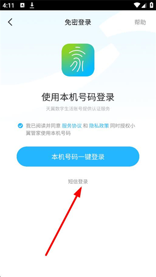 2、在登錄方式選擇頁面,點(diǎn)擊短信登錄,進(jìn)入短信登錄頁面。