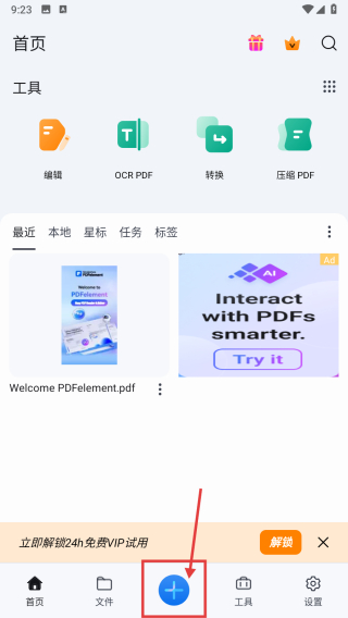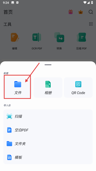 1、打開PDF處理類應(yīng)用,點(diǎn)擊底部+號選項(xiàng),彈出資源選擇菜單。