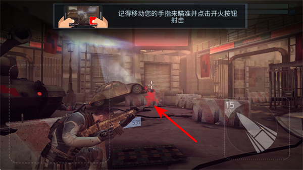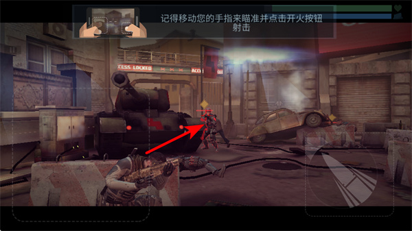 3、遇到不同位置的敵人時,移動手指來瞄準(zhǔn),再點擊開火按鈕射擊,應(yīng)對多樣敵人分布。