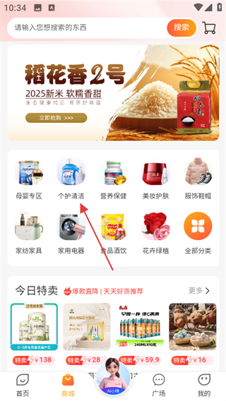 2、在商城頁面,點擊個護清潔可進入個護清潔分類頁面。