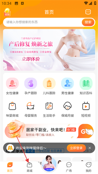1、打開咪嬰伴侶,在首頁點擊商城,可進入商城分類頁面。