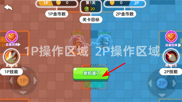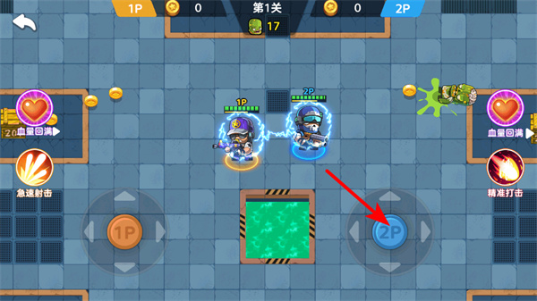 4、在戰(zhàn)斗中,操控2P操作區(qū)域的搖桿,移動(dòng)角色,與隊(duì)友配合,共同擊敗敵人,完成目標(biāo)。