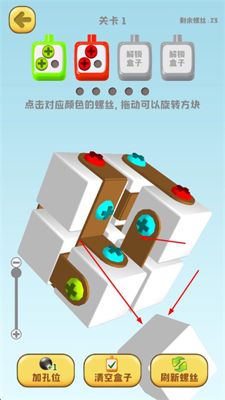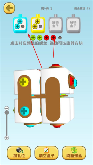 1、點擊對應(yīng)顏色的螺絲,拖動可旋轉(zhuǎn)方塊,調(diào)整方塊布局,為螺絲歸類創(chuàng)造條件。