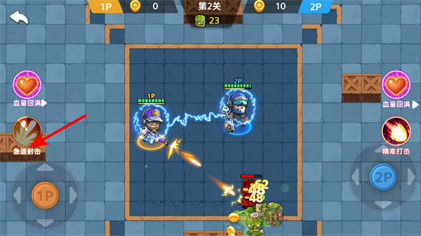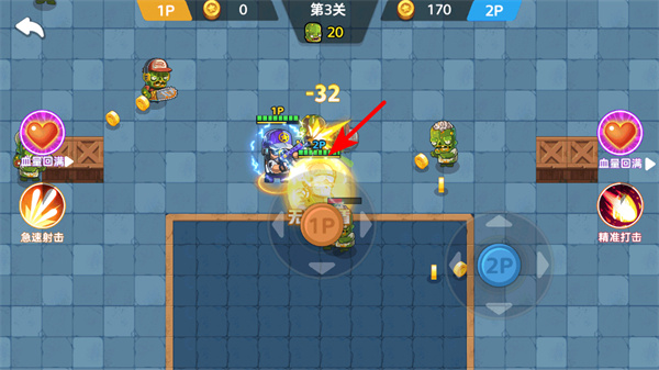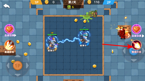 3、當(dāng)敵人出現(xiàn)時,點擊2P區(qū)域的精準(zhǔn)打擊技能按鍵,可對敵人造成精準(zhǔn)傷害,助力消滅敵人。