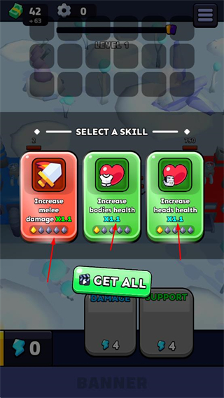 3、選擇技能如提升近戰(zhàn)傷害、身體或頭部生命值,增強角色戰(zhàn)力,應(yīng)對不同戰(zhàn)斗需求。