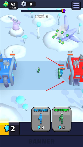 2、在戰(zhàn)斗場景中操控角色進攻敵方建筑,推進戰(zhàn)線,擴大戰(zhàn)斗優(yōu)勢。