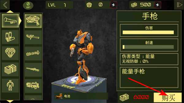 2、在武器界面,點擊購買按鍵,可獲取能量手槍,提升機器人的戰(zhàn)斗能力,助力應(yīng)對敵人。