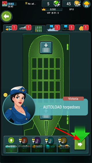 1、在潛艇界面,點(diǎn)擊下方的綠色箭頭按鍵,可開啟自動(dòng)裝填魚雷功能,提升魚雷使用效率。