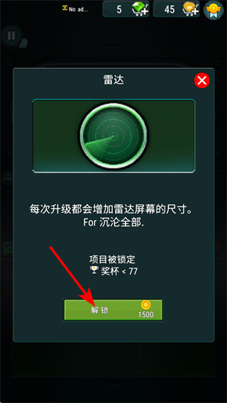 2、在雷達(dá)界面,點(diǎn)擊解鎖按鍵,消耗1500金幣可解鎖雷達(dá),增加雷達(dá)屏幕尺寸,助力探測。