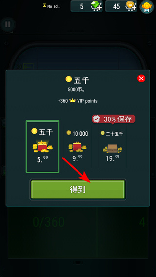 3、在金幣獎(jiǎng)勵(lì)界面,點(diǎn)擊得到按鍵,可獲取五千金幣,積累資源用于潛艇升級(jí)和功能解鎖。
