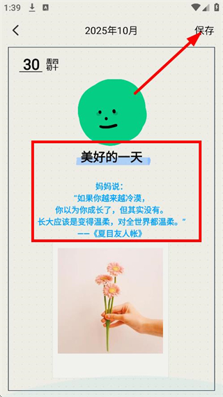 3、在日記編輯頁面,輸入日記內容后點擊保存,完成日記記錄操作。