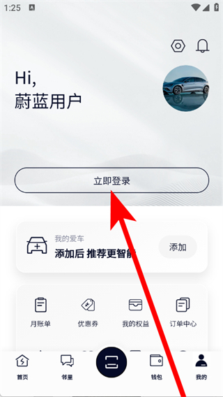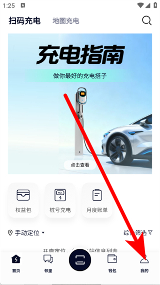 1、打開(kāi)蔚藍(lán)快充,點(diǎn)擊底部導(dǎo)航欄我的,進(jìn)入個(gè)人中心頁(yè)面。