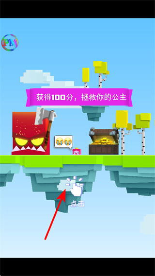 2、點擊屏幕可發(fā)起攻擊,擊敗敵人獲取分數(shù),積累100分可拯救公主,推進游戲劇情。