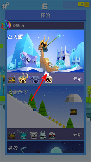 3、在探險界面,選擇“巨人國”區(qū)域,點擊開始按鍵,開啟新的探險關(guān)卡。