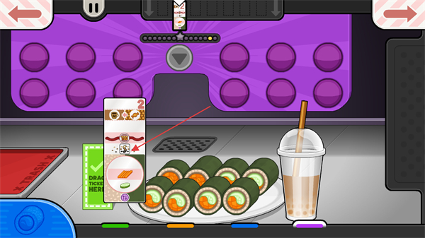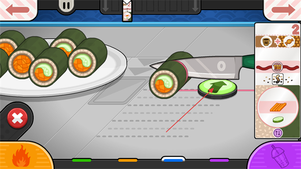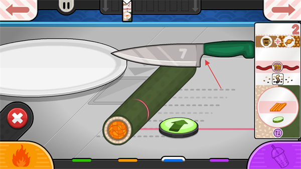 2、根據(jù)菜單卷好壽司后,拖動刀具瞄準好虛線位置。