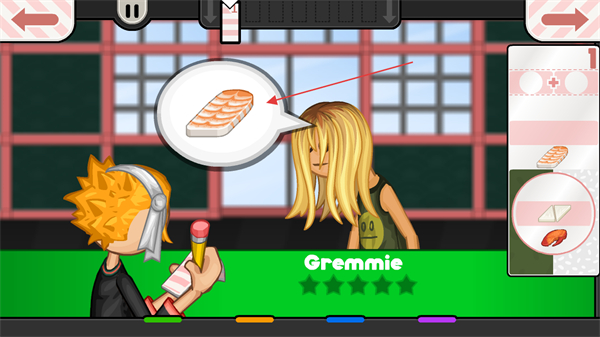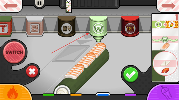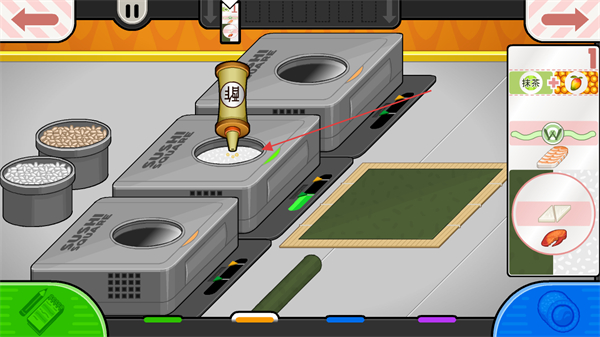4、根據(jù)菜單,選擇裝飾蘸料,拖動(dòng)壽司進(jìn)行涂抹。