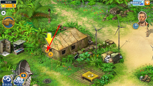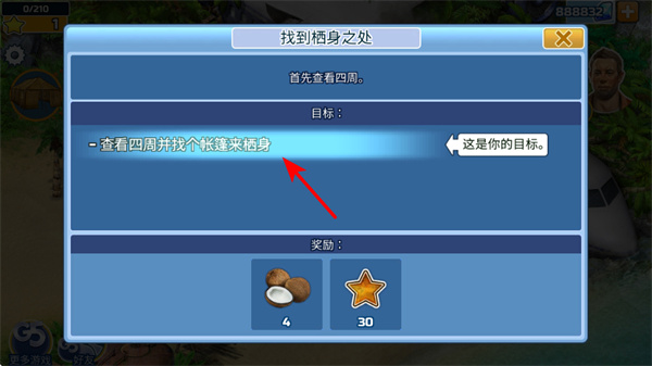 4、朝著紅色箭頭指引的帳篷區(qū)域移動(dòng),找到帳篷后完成找到棲身之處任務(wù),獲取椰子等獎(jiǎng)勵(lì),推進(jìn)游戲進(jìn)程。