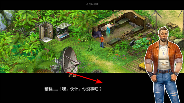 1、在劇情對話界面,點(diǎn)擊點(diǎn)擊以繼續(xù),可推進(jìn)與約翰的劇情互動,了解荒島生存的背景故事,解鎖后續(xù)游戲內(nèi)容。