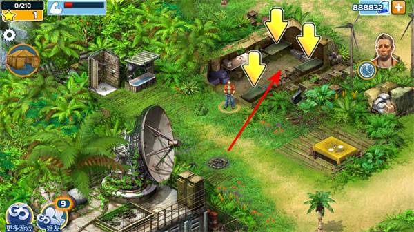 3、朝著紅色箭頭指引的區(qū)域移動,該區(qū)域存在可互動的任務(wù)點(diǎn),完成互動可推進(jìn)荒島生存任務(wù),提升荒島生存能力。