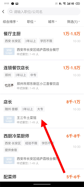 2、在餐飲崗位列表,選擇目標崗位,點擊進入崗位詳情頁。