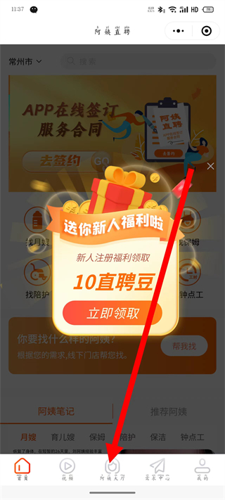 1、打開阿姨直聘,點擊底部導(dǎo)航欄的阿姨大廳,進入阿姨列表頁面。