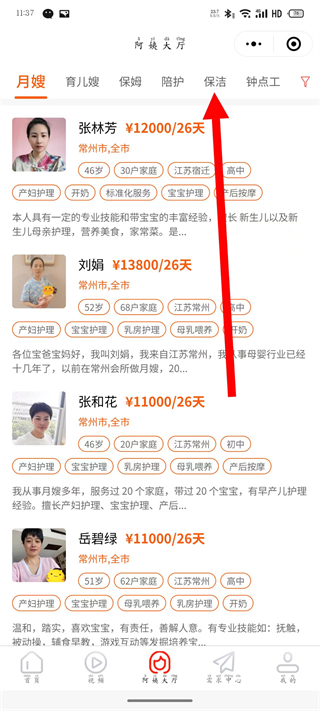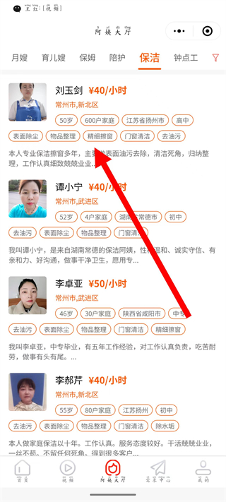 2、在阿姨列表頁面,選擇保潔分類,進入保潔阿姨列表。