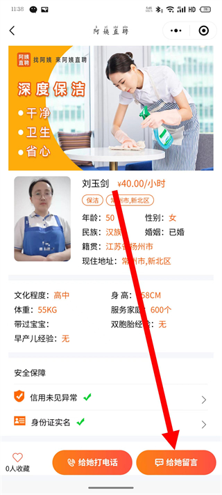 4、在阿姨詳情頁,點擊給她留言按鈕,溝通保潔服務(wù)相關(guān)事宜。