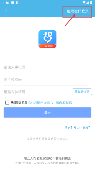 3、在登錄注冊(cè)頁(yè)面,點(diǎn)擊賬號(hào)密碼登錄選項(xiàng),進(jìn)入賬號(hào)密碼登錄信息填寫頁(yè)面。
