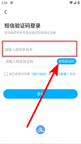 3、在登錄頁(yè)面,輸入手機(jī)號(hào),點(diǎn)擊獲取驗(yàn)證碼。