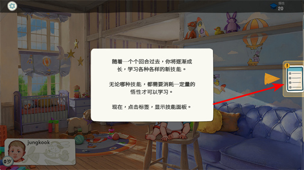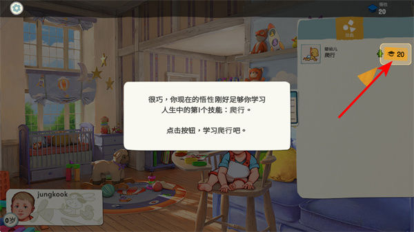 2、當(dāng)悟性足夠?qū)W習(xí)技能時,點擊對應(yīng)的技能按鈕,如爬行技能按鈕,可以學(xué)習(xí)人生中的首個技能,開啟成長之旅。