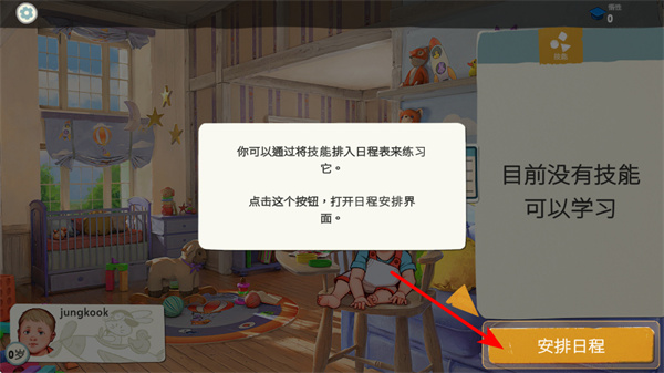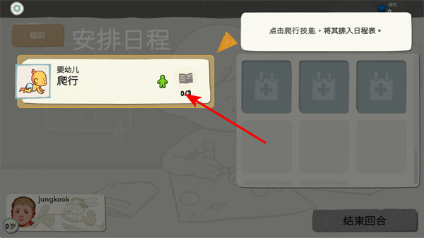 4、在安排日程界面,點擊已學(xué)習(xí)的技能,如爬行技能,排入日程表,規(guī)劃角色的練習(xí)內(nèi)容,每個回合都能有效成長。
