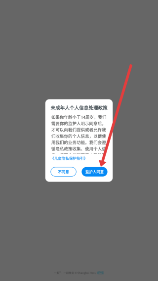 1、面對(duì)未成年人個(gè)人信息處理政策彈窗,通過點(diǎn)擊監(jiān)護(hù)人同意按鈕,確認(rèn)同意后進(jìn)入應(yīng)用后續(xù)流程。