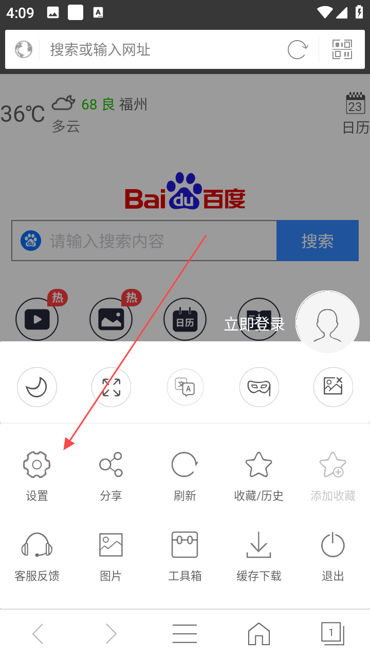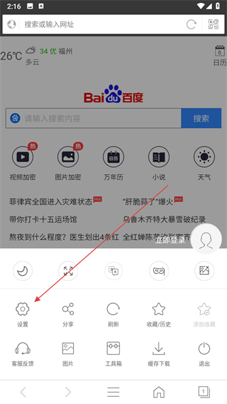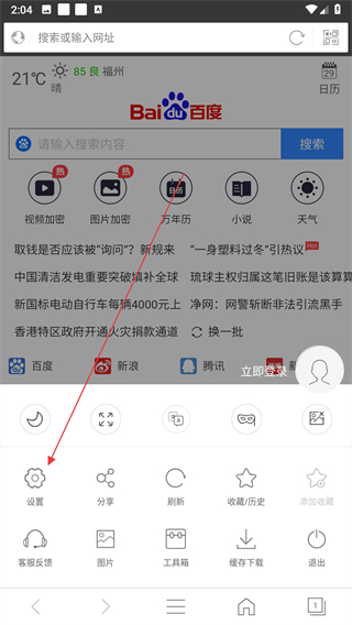 2、在功能列表中選擇設(shè)置選項(xiàng),進(jìn)入瀏覽器的設(shè)置頁(yè)面。