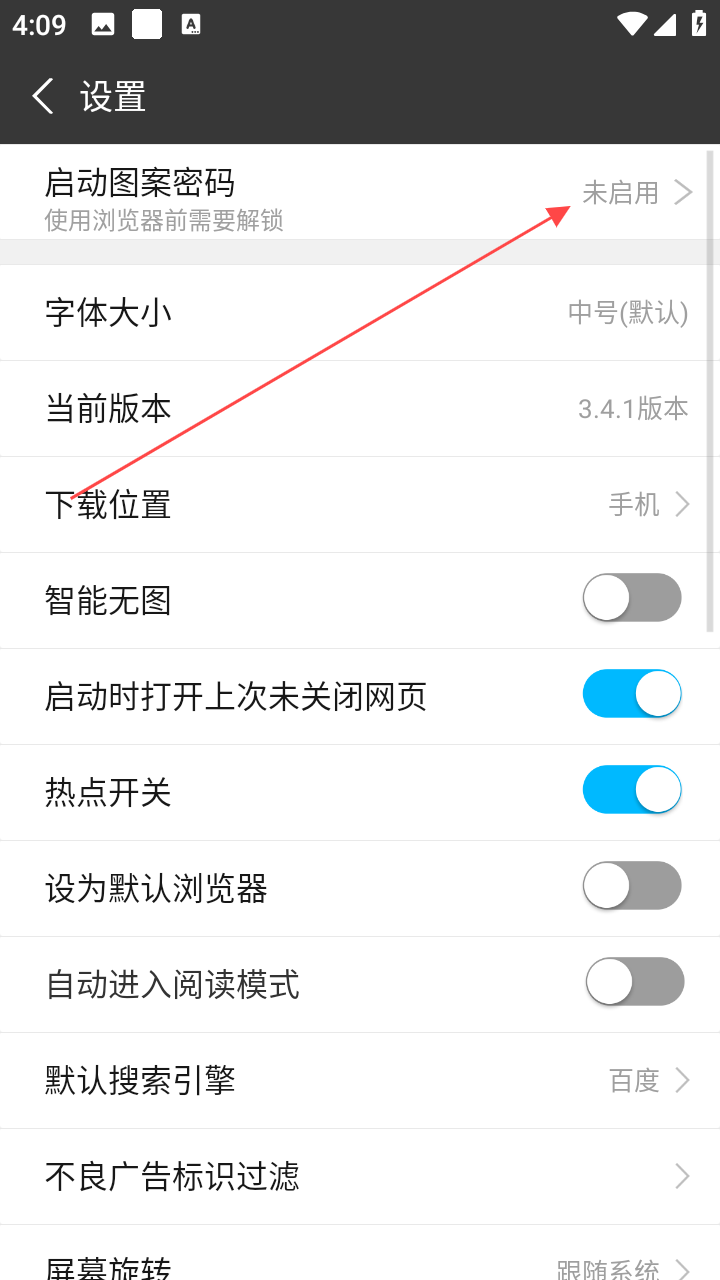 2、在設(shè)置頁(yè)面中,找到啟動(dòng)圖案密碼選項(xiàng),點(diǎn)擊其右側(cè)未啟用的箭頭標(biāo)識(shí),進(jìn)入啟動(dòng)圖案密碼設(shè)置界面。
