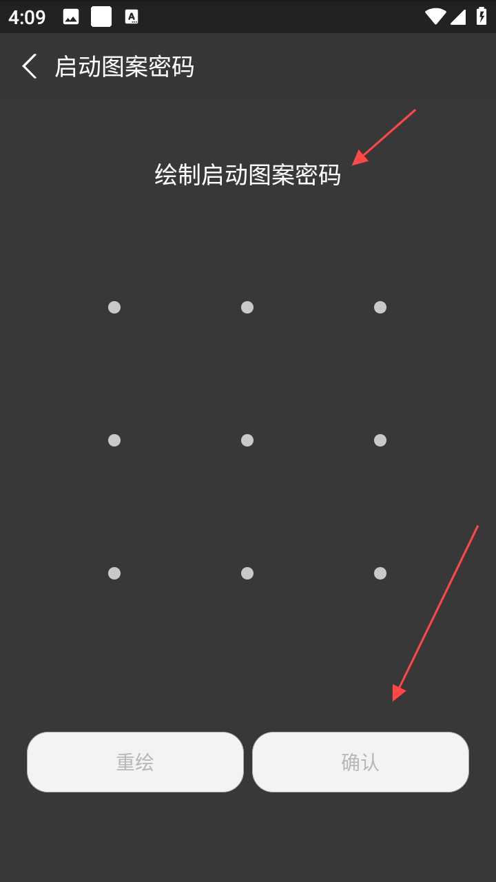 3、在繪制啟動(dòng)圖案密碼界面,按照個(gè)人需求在九宮格上繪制圖案密碼,繪制完成后點(diǎn)擊確認(rèn)按鈕,若繪制有誤,可點(diǎn)擊重繪按鈕重新繪制。