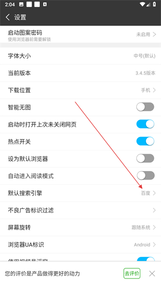 3、找到默認(rèn)搜索引擎選項(xiàng)并點(diǎn)擊,進(jìn)入搜索引擎選擇頁(yè)面。