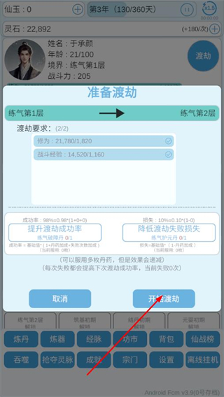 2、進(jìn)入準(zhǔn)備渡劫界面,確認(rèn)渡劫要求已滿足后,點(diǎn)擊開始渡劫,嘗試提升境界。