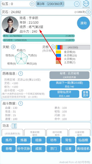 4、渡劫成功后,回到主界面,可看到自身境界、戰(zhàn)斗力等屬性得到提升,繼續(xù)積累修為和戰(zhàn)斗經(jīng)驗(yàn),為下一次渡劫做準(zhǔn)備。