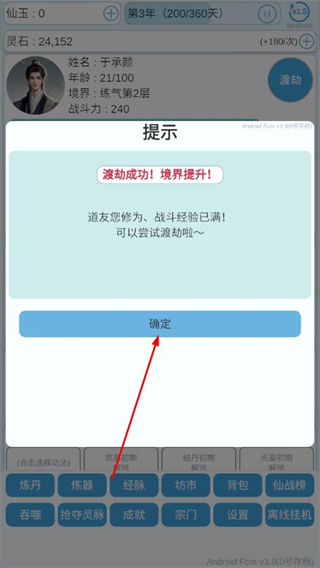 3、渡劫成功后,會(huì)彈出提示界面,點(diǎn)擊確定,即可確認(rèn)境界提升,繼續(xù)修仙之路。