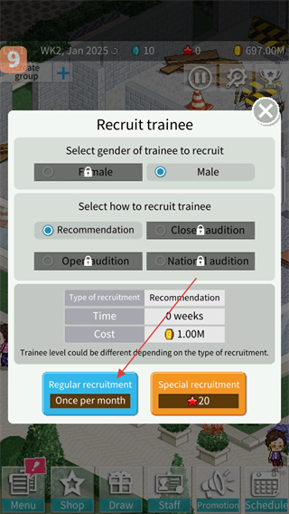 3、在招募界面選擇性別、招募方式如推薦制,點(diǎn)擊Regularrecruitment進(jìn)行常規(guī)招募。