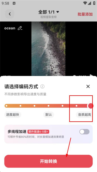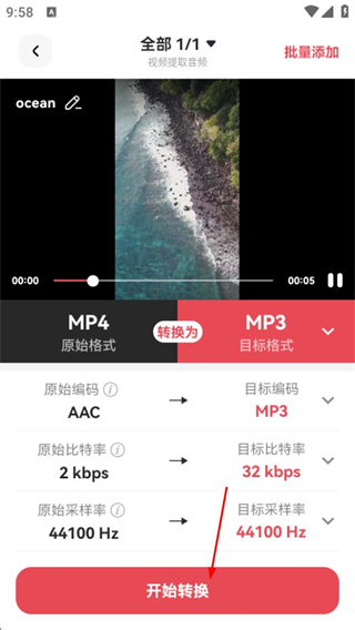 4、在該頁面,選擇編碼方式后再次點擊開始轉(zhuǎn)換,即可開始提取視頻中的音頻。