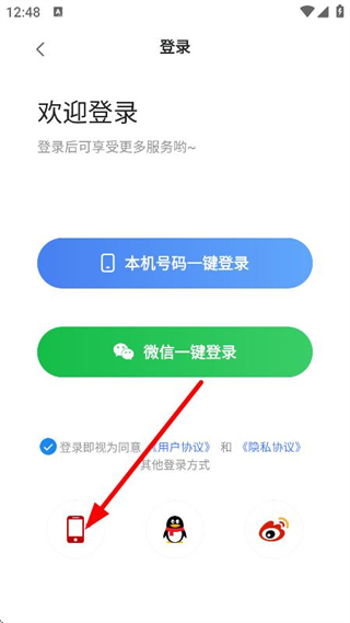 3、在登錄頁面,點擊手機號登錄圖標,進入手機號登錄界面。