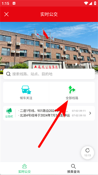 2、在實(shí)時(shí)公交頁面,點(diǎn)擊全部線路,進(jìn)入線路列表頁。
