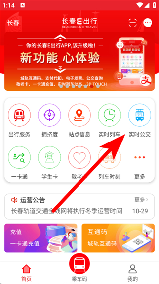 1、打開長春E出行,在首頁點(diǎn)擊實(shí)時(shí)公交,進(jìn)入實(shí)時(shí)公交頁面。