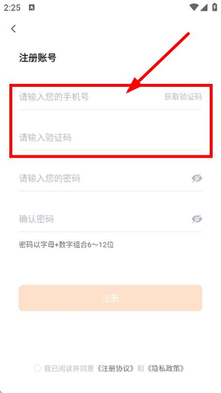 3、在注冊(cè)賬號(hào)頁(yè)面,輸入手機(jī)號(hào)后點(diǎn)擊獲取驗(yàn)證碼并輸入。