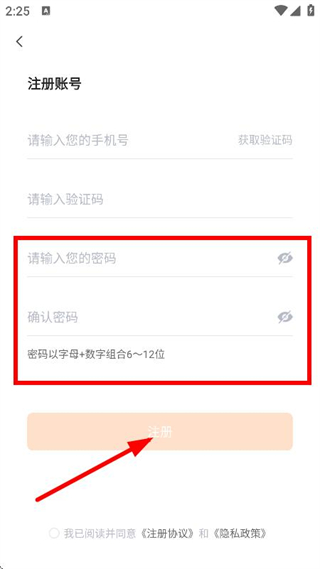 4、在設(shè)置密碼并再次輸入確認(rèn)后,點(diǎn)擊注冊(cè),完成賬號(hào)注冊(cè)操作。