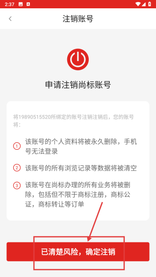 4、在申請注銷賬號頁面,點擊已清楚風險,確定注銷按鈕,完成賬號注銷操作。