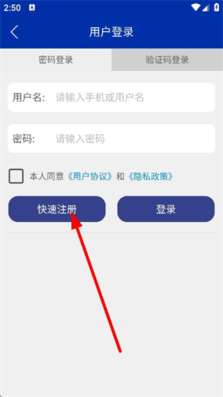 3、在用戶登錄頁面,點擊快速注冊,進入用戶注冊頁面。