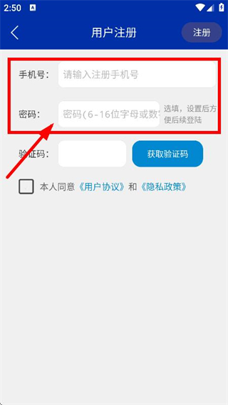 4、隨后我們可以在用戶注冊頁面,填寫手機號和密碼。