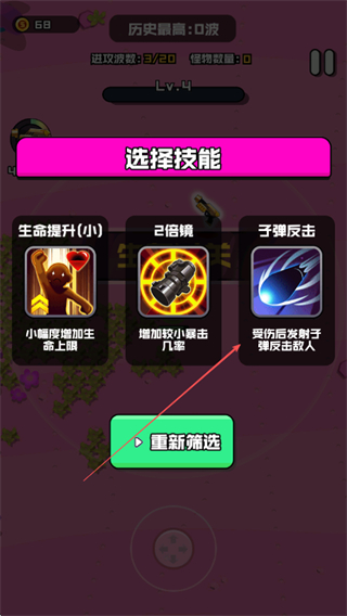 2、消滅怪物后會(huì)出現(xiàn)技能選擇界面,可選擇生命提升,2倍鏡,子彈反擊等技能,增強(qiáng)角色戰(zhàn)力,助力后續(xù)戰(zhàn)斗。